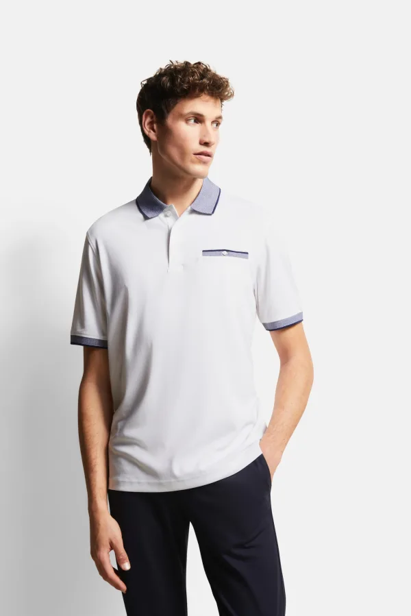 Een modern poloshirt met mooi gecoördineerde contrasterende strepen op de kraag, mouwboorden en zaksluiting. De polokraag, zijsplitten voor de nodige bewegingsvrijheid en geribde manchetten maken deze polo tot een klassieke metgezel.