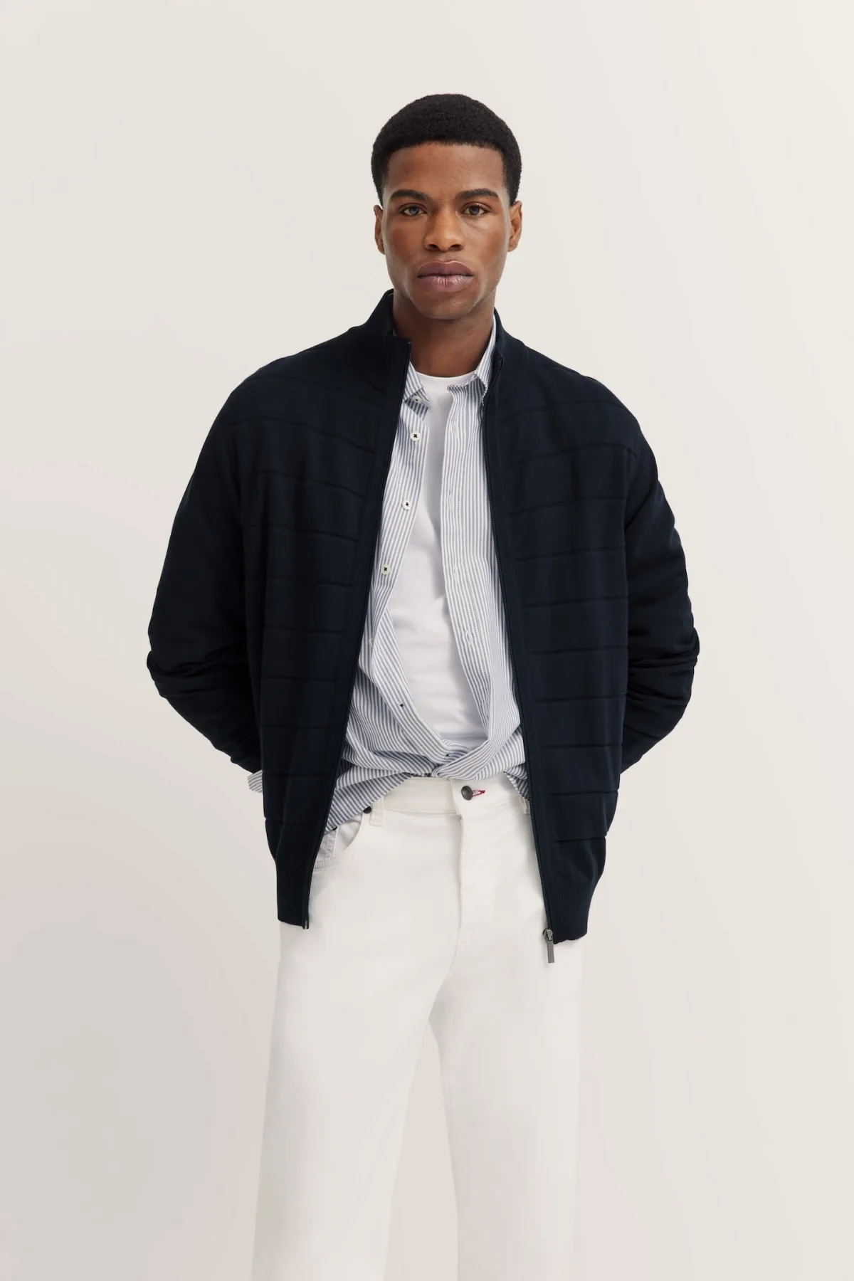 Geniet van eersteklas stijl en comfort met het gebreide vest van bugatti, dat functionaliteit en design vakkundig combineert. Dit vest wordt gekenmerkt door gestructureerde strepen in een 3D-look aan de voorkant, terwijl de mouwen en achterkant effen gebreid zijn voor een eenvoudige elegantie.
