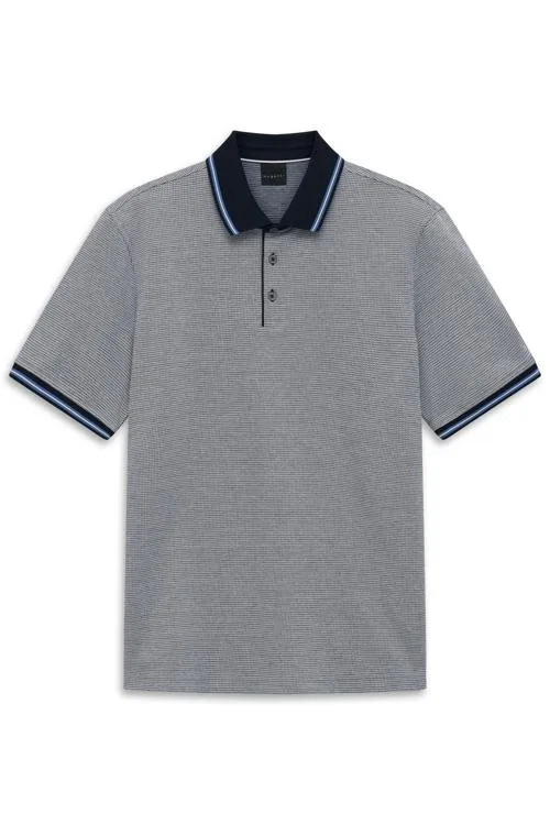 Deze Bugatti heren polo is uitgevoerd in ademende piqué-tricot met een fijn grijs microdessin. De contrastkraag in marine met wit-blauw streepaccent geeft een verzorgde look. De 3-knopen sluiting en geribde mouwboorden met streepdetail zorgen voor een nette afwerking. Korte mouw en zonder borstzak voor een cleane uitstraling. Onder categorie Heren, T-Shirts & Polo's. Artikel: Bugatti Polo 8150-15103E.