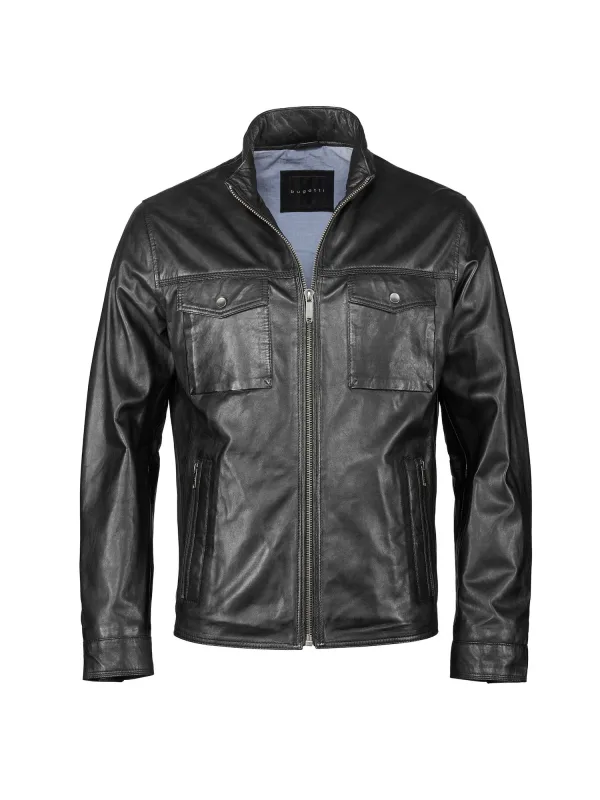 Design: Staande kraag, Borstzak, Ritszakken aan de zijkant; Type sluiting: Ritssluiting; Type jas: Bikerjack; Voering: Licht gevoerd; Materiaal: Leer; Motief: Effen; Extra's: Op staal naden, Stevige stof; Pasvorm: Normale pasvorm