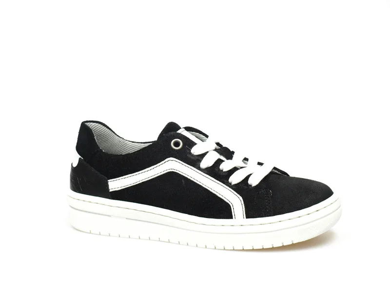 Lage schoen met veters. Vans look. Materiaal leder van buiten en cambrelle van binnen. Met witte accenten. Pasvorm normaal tot iets breder.