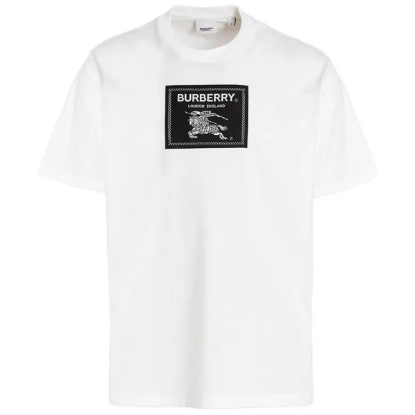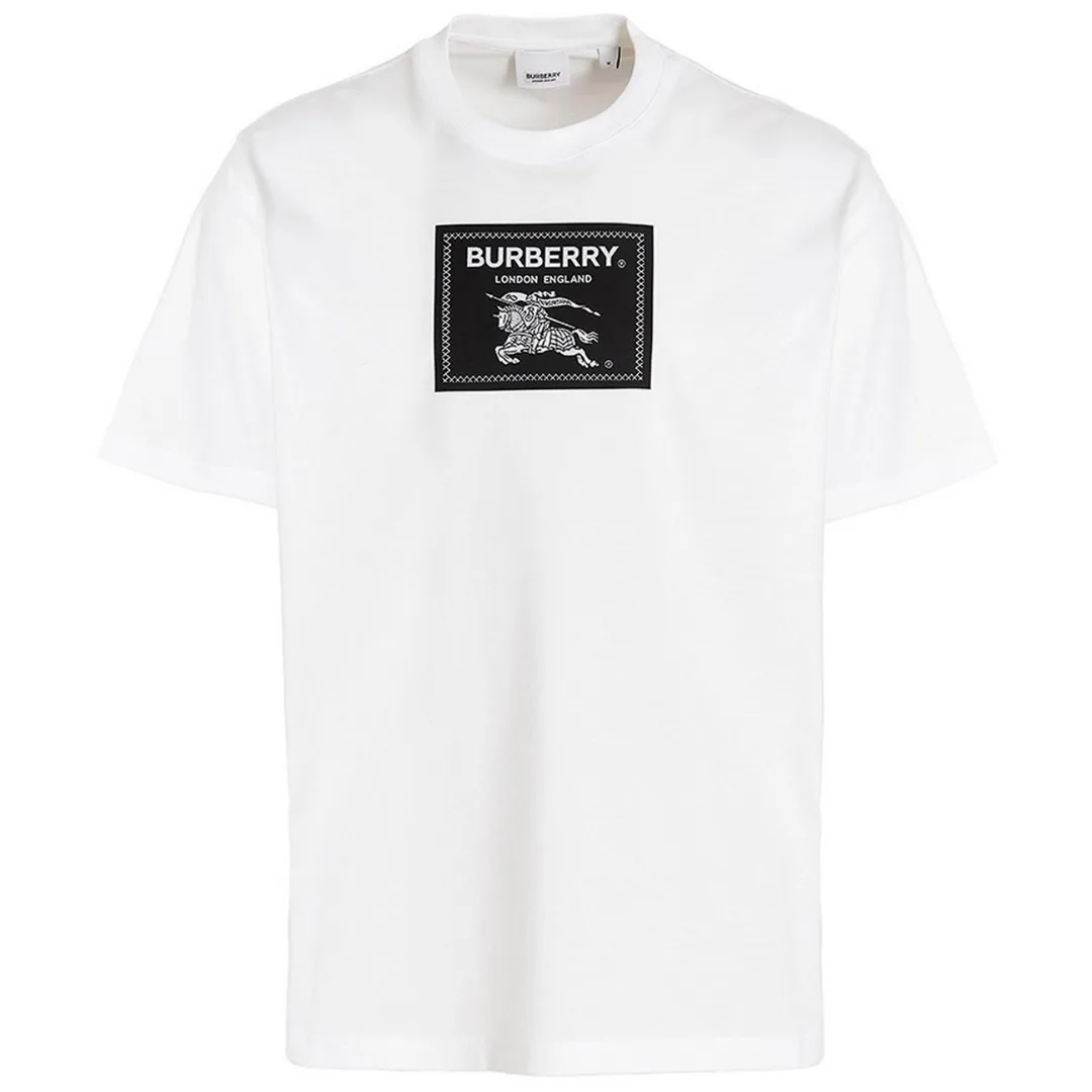 Burberry Box Logo White T-Shirt. Elevate your style with the Burberry White T-Shirt. This iconic White T-Shirt from Burberry is not only fashionable, but it also offers a comfortable fit and premium quality. Perfect for any occasion, this shirt will make you stand out and feel confident.. 100% Cotton, Crew Neck. Made In Portugal. Box Logo. Style: 8064397 Roundwood