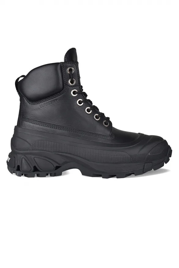 Zwarte Arthur Burberry-laarzen.Van kalfsleer en gepolijste schapenvacht.Voorsluiting met zwarte veters.Versterkte oogjes.Logopatch op de tong.'Burberry'-letters op de buitenkant.Geruite canvasvoering.Gespsluiting aan de achterkant.Zwarte rubberen buitenzool.Witte 'Burberry'-letters op de achterkant van zool.Gemaakt in Italië.