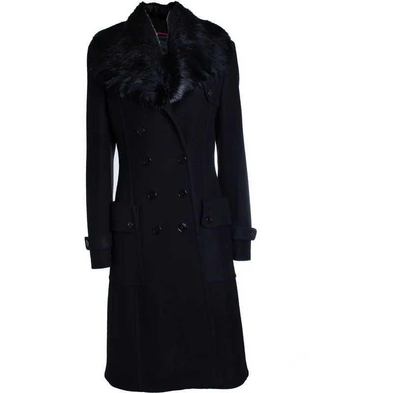 Burberry, zwarte wollen trenchcoat met bontkraag.