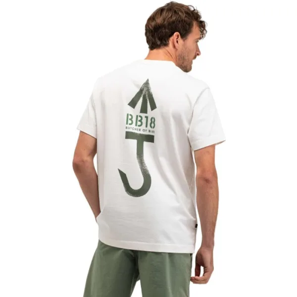 Dit off white T-shirt voor heren van Butcher of Blue is gemaakt van organisch-katoen en heeft een ronde hals. De pasvorm valt los en iets royaal. Op de voorzijde staat een kleine print, met een grotere print op de rug. Draag het bijvoorbeeld op een jeans of short voor een moderne look. Een cleane basis met een duidelijke print en een zelfverzekerde uitstraling.