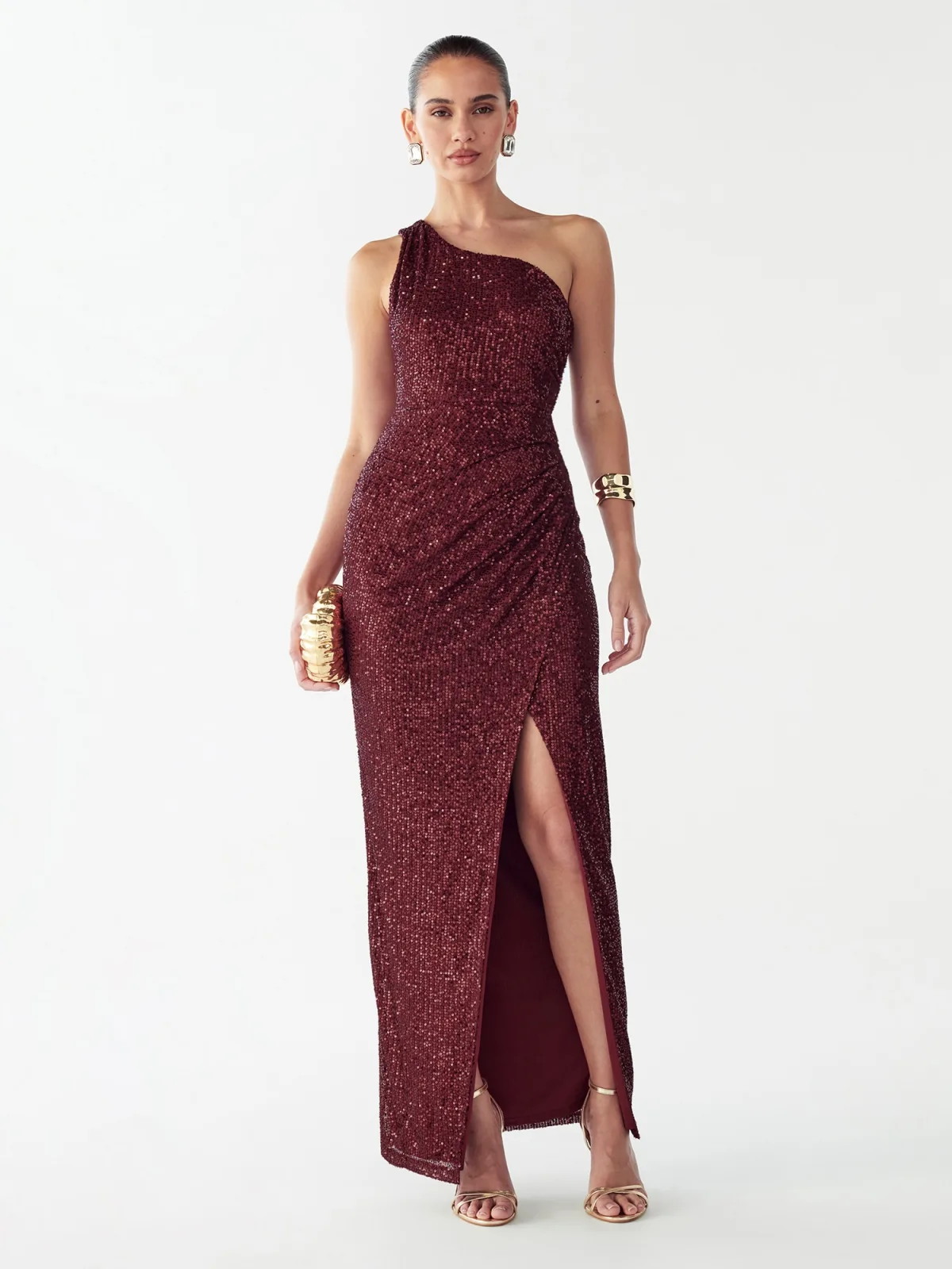 Design: Beenopening; Motief: Effen; Soort bandjes: One-shoulder; Details: Cut-outs, Plooien, Gedrapeerd, Wikkel design; Extra's: Glitterend; Lengte: Lang/maxi; Snit: Getailleerd; Pasvorm: Slanke pasvorm; Armlengte: Mouwloos