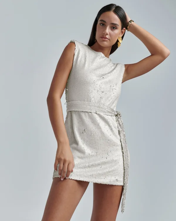 Design: Keyholesluiting, Met band/snoer, Rug rits; Type sluiting: Ritssluiting; Halstype: Ronde hals; Motief: Effen; Details: Cut-outs, Pailletten; Extra's: Lichte stof, Omkeerbare pailletten; Lengte: Kort/mini; Snit: Getailleerd; Pasvorm: Normale pasvorm; Armlengte: Mouwloos