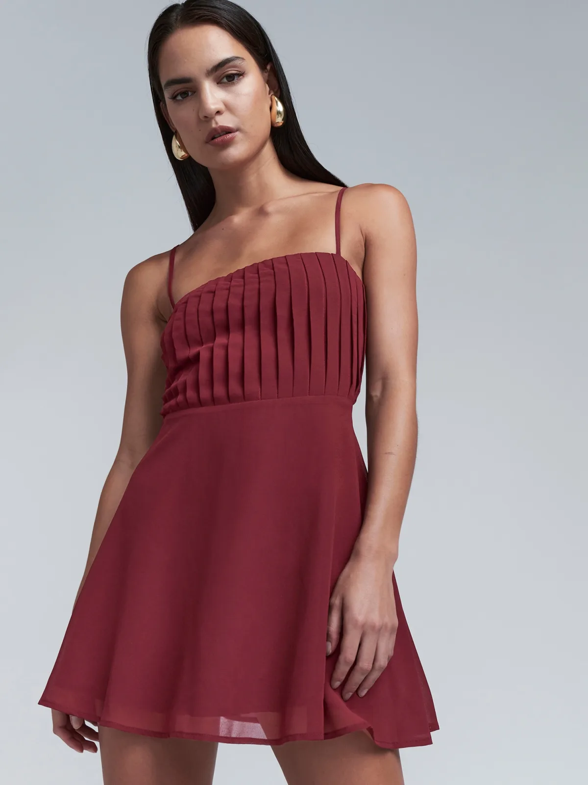 Design: Gevoerde zoom/rand; Type sluiting: Ritssluiting; Halstype: Carréhals; Motief: Effen; Soort bandjes: Spaghettibandjes; Details: Gedrapeerd, Plissé; Extra's: Op staal naden; Lengte: Kort/mini; Snit: Getailleerd; Pasvorm: Normale pasvorm; Armlengte: Mouwloos