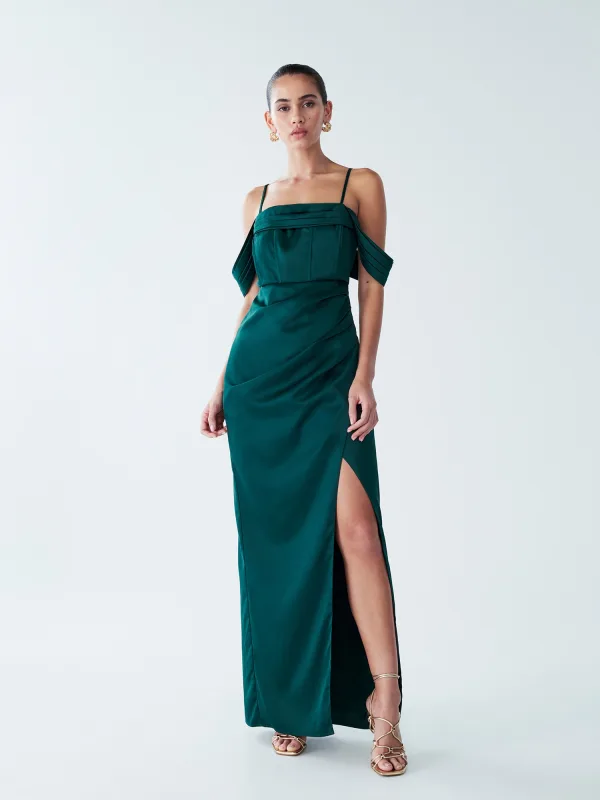 Design: Beenopening; Type sluiting: Ritssluiting; Halstype: Carréhals; Motief: Effen; Soort bandjes: Spaghettibandjes; Details: Gedrapeerd; Extra's: Op staal naden; Lengte: Lang/maxi; Snit: Getailleerd; Pasvorm: Slanke pasvorm; Armlengte: Mouwloos