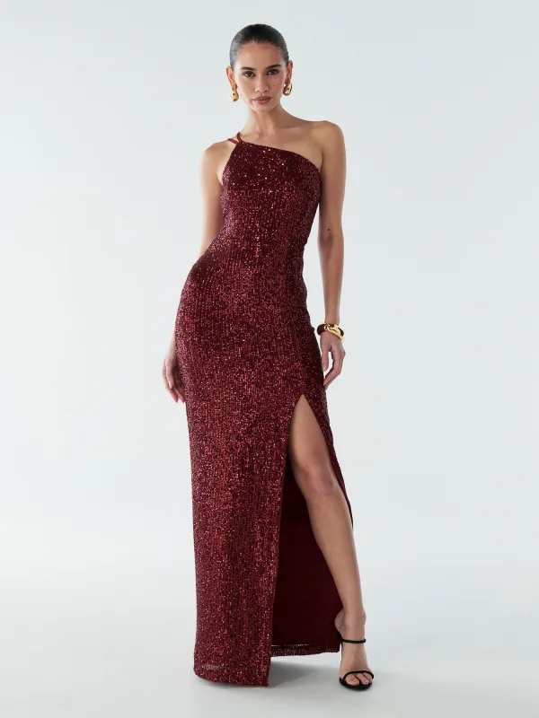 Design: Zijdelingse inkepingen; Type sluiting: Ritssluiting; Motief: Effen; Soort bandjes: One-shoulder; Extra's: Glitterend, All-over patroon, Burnout effect, Oplichtende stof; Lengte: Lang/maxi; Snit: Figuur omarmend; Pasvorm: Aansluitende pasvorm; Armlengte: Mouwloos