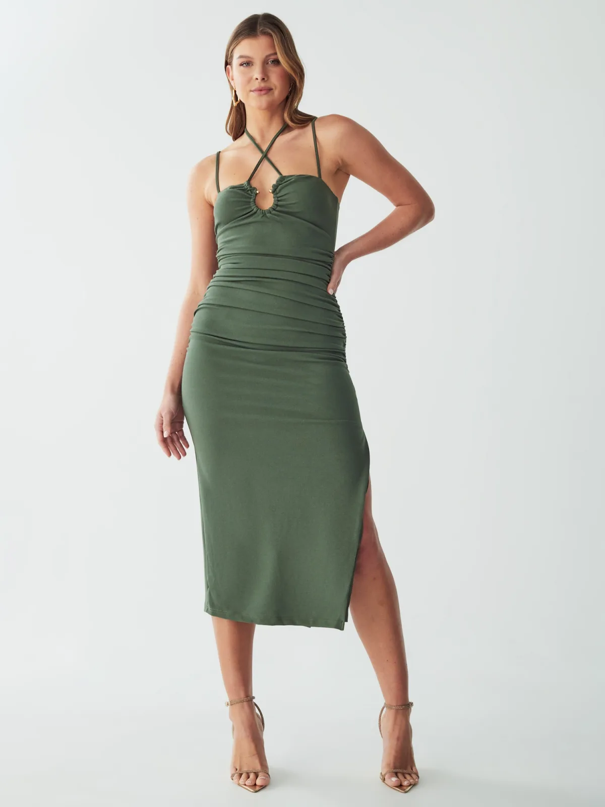 Design: Diepe snit/decolleté; Type sluiting: Ritssluiting; Motief: Effen; Soort bandjes: Spaghettibandjes; Extra's: Op staal naden; Lengte: 3/4 lengte; Snit: Figuur omarmend; Pasvorm: Normale pasvorm; Armlengte: Mouwloos