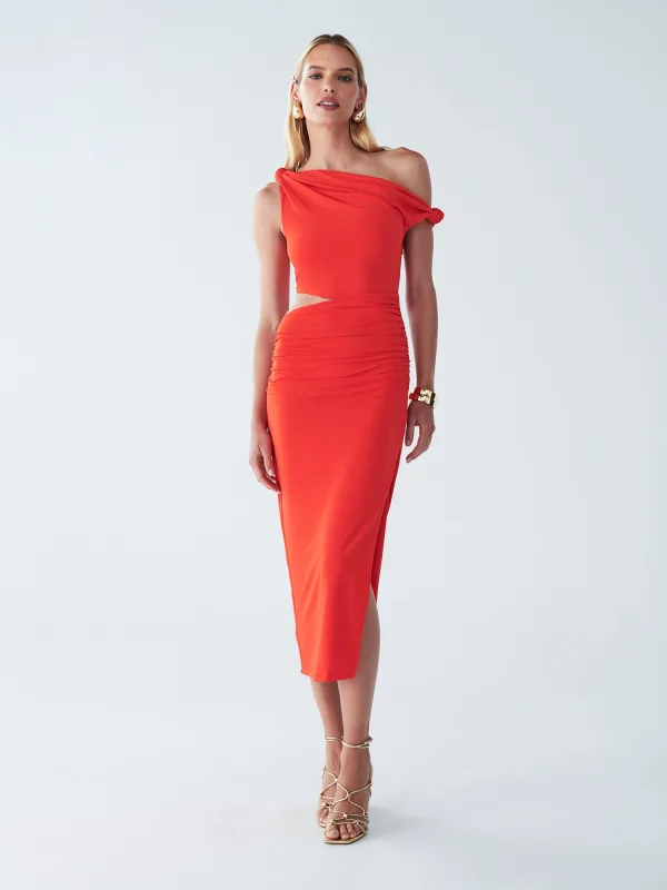 Design: Gevoerde zoom/rand, Ritszakken aan de zijkant; Type sluiting: Ritssluiting; Motief: Effen; Soort bandjes: One-shoulder; Details: Cut-outs, Gedrapeerd; Extra's: Op staal naden, Gladde stof; Lengte: 3/4 lengte; Snit: Figuur omarmend; Pasvorm: Aansluitende pasvorm; Armlengte: Mouwloos