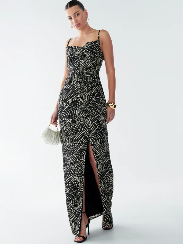 Design: Beenopening, Rug rits; Type sluiting: Ritssluiting; Materiaal: Satijn; Halstype: Watervalhals; Soort bandjes: Spaghettibandjes; Details: Gedrapeerd, Wikkel design; Extra's: Verstelbare bandjes, All-over patroon; Lengte: Lang/maxi; Snit: Getailleerd; Pasvorm: Normale pasvorm; Armlengte: Mouwloos