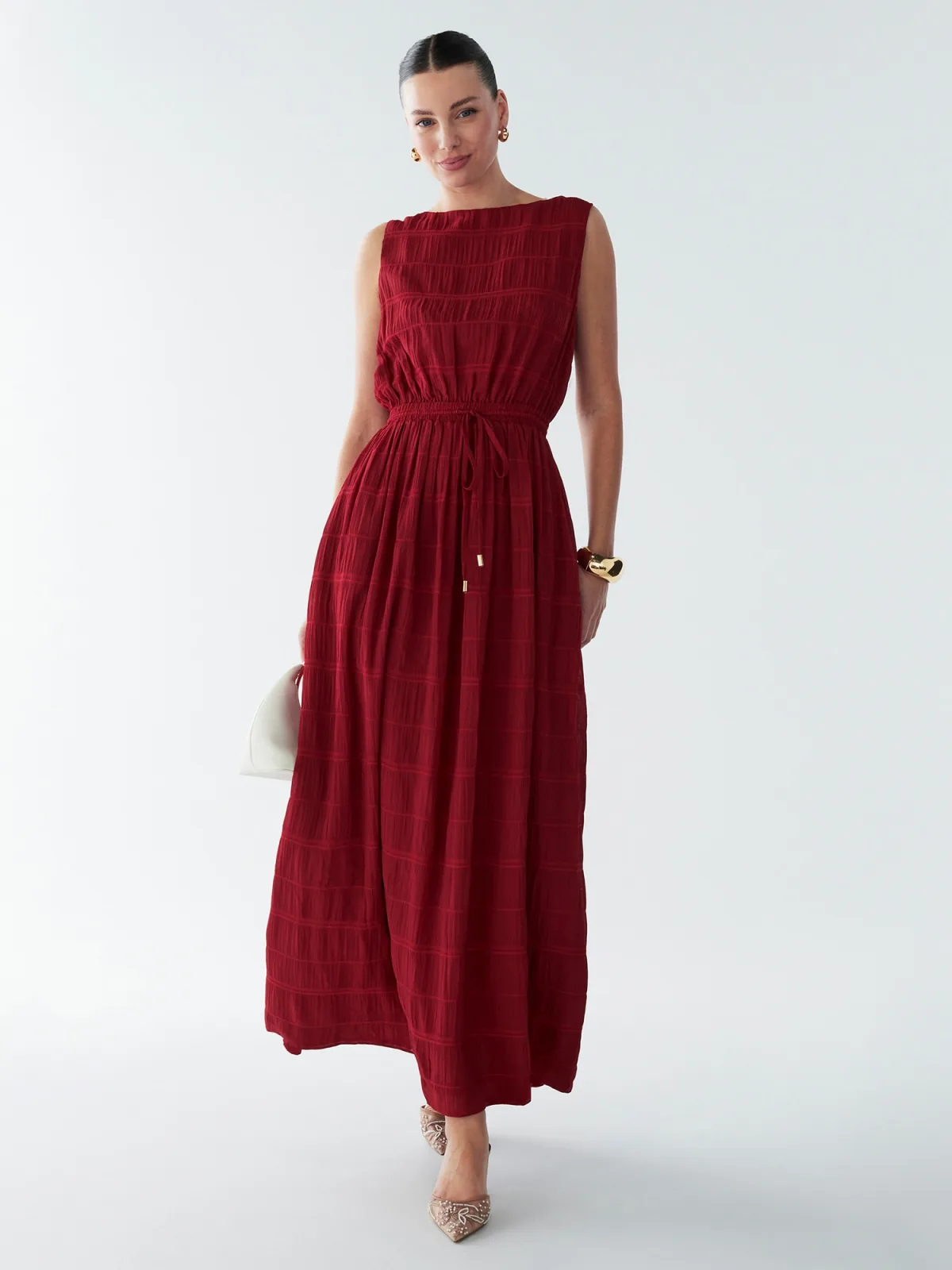 Design: Keyholesluiting, Tailleband; Type sluiting: Knoopsluiting; Halstype: Boothals; Motief: Effen; Details: Cut-outs, Gedrapeerd; Extra's: Verstelbare taille, Met textuur; Lengte: Lang/maxi; Pasvorm: Normale pasvorm; Armlengte: Mouwloos