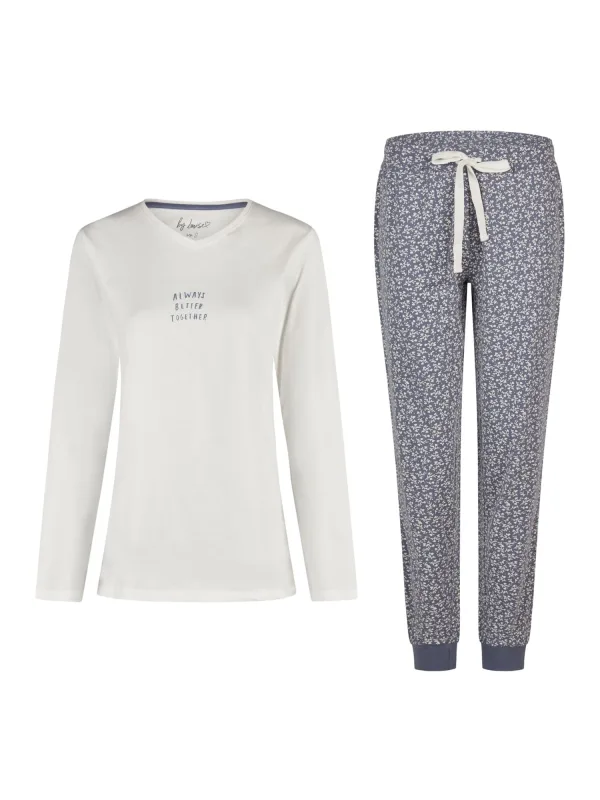 By Louise Dames pyjama set lang v-hals off-white/donkerblauw gebloemd