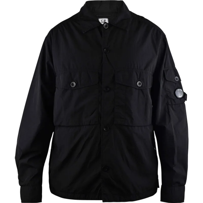 C.P. Company zwart jack.Lange mouw met kraag.Knoopzakken op de voorkant en de linkermouw.C.P. Company logopatch op de linkermouwzakken.Knoopsluiting.100% polyamide.