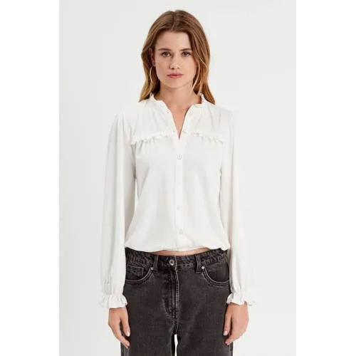 Deze blouse van Cache Cache heeft een klassieke kraag en lange ballonmouwen. De blouse is gemaakt van polyester en heeft ruches. Je sluit dit model makkelijk met knopen aan de voorkant.