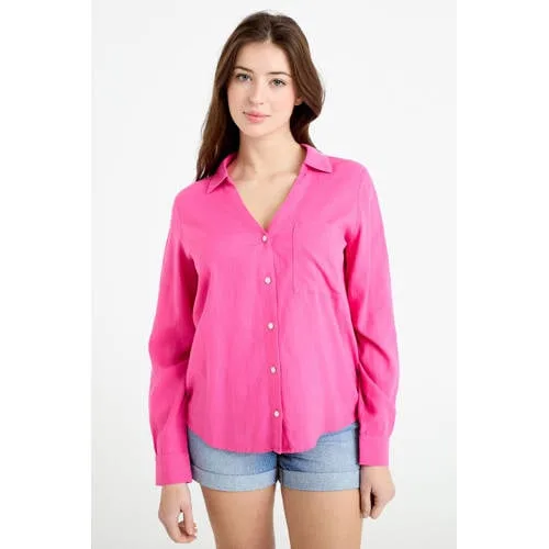 Voor een frisse, verzorgde look in je dagelijks leven is deze roze linnen blouse van Cache Cache een praktische basis. Het model heeft een rechte pasvorm, een klassieke kraag en lange mouwen, waardoor het net zo geschikt is voor kantoor als voor een ontspannen dag in de stad. De stof met linnen en viscose voelt licht en luchtig aan, prettig wanneer de temperatuur oploopt.Details die elke dag kloppen Overhemdmodel met klassieke kraag voor een klassieke uitstraling Lange mouwen met rechte mouwinzet voor een nette, rustige look Rechte pasvorm die het silhouet subtiel volgt Gemaakt van 55 procent linnen en 45 procent viscose voor een lichte, soepele touch Effen roze kleur, eenvoudig te combineren met zowel denim als nette broeken Borstzak als praktisch en stijlvol detail Met knoopsluiting aan de voorkant Beschikbaar in maat 34 tot en met 46, valt klein, veel vrouwen kiezen een maat groterStyling voor werk en vrije tijdDraag de blouse in een aangesloten broek met loafers voor een praktische, dagelijkse outfit. Voor een andere stijl combineer je het overhemd met een vloeiende midi-rok en enkellaarsjes. Een denim jasje of gestructureerde tas maakt de set eenvoudig compleet.Zorg voor deze blouseWassen kan op 30°C op een ultra-delicaat programma. Laat de blouse aan de lucht drogen en vermijd de droger en chemisch reinigen. Strijken op lage temperatuur, tot maximaal 110 graden, helpt om de stof mooi glad te houden.Een lichte blouse die je zonder moeite inzet voor allerlei momenten op de dag.