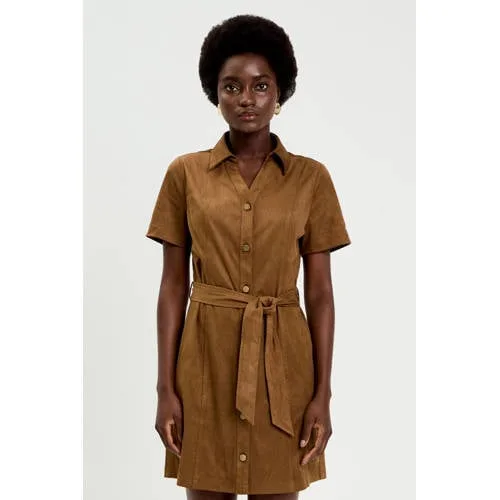 Voor een geraffineerde, maar toch ontspannen uitstraling is deze Cache Cache suèdelook jurk een geschikte keuze voor verschillende momenten. Het korte, rechte model met getailleerde snit volgt subtiel de lijnen van het lichaam en laat de taille duidelijk uitkomen. De overhemdkraag en knoopsluiting geven de jurk een verzorgde, blouseachtige look, terwijl de korte mouwen het geheel luchtig houden. De zachte suèdelook in een effen bruine kleur zorgt voor een moderne en tegelijk rustige basis in de garderobe.Verzorgde details in suèdelook Korte jurk met rechte, licht getailleerde pasvorm Overhemdkraag en volledige knoopsluiting aan de voorkant Korte, rechte mouwen voor een moderne, heldere lijn Bijpassende ceintuur om de taille extra te accentueren Effen bruine kleur, eenvoudig te combineren Geen zakken voor een strakke, gladde look Verkrijgbaar in maat 36 tot en met 46 Het model valt klein, een maat groter kan meer ruimte geven Onderhoud: wassen op 30°C in een ultra-delicaat programma, niet drogen in de droger, strijken op lage temperatuur tot maximaal 110°Van kantoordag tot dinerDeze korte jurk leent zich goed voor uiteenlopende momenten op de dag. Naar het werk zorgt de overhemdkraag voor een nette uitstraling. Voor een etentje of afspraak valt de ceintuur extra op en geeft de suèdelook extra diepte aan de bruine kleur.Cache Cache: eigentijdse stijl voor elke dagCache Cache ontwikkelt mode die aansluit bij het dagelijkse leven, met aandacht voor pasvorm en draaggemak. De collecties combineren herkenbare basics met actuele details, zodat kledingstukken makkelijk in de bestaande garderobe passen en vaak gedragen kunnen worden.Een makkelijk te combineren jurk die zowel overdag als in de avond van pas komt.