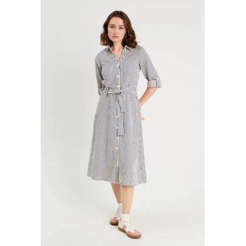 Deze jurk van Cache Cache is een blousejurk gemaakt van polyester. Het heeft een knoopsluiting en een klassieke kraag. Met korte mouwen en een ceintuur heeft deze midilengte jurk een borstzak.