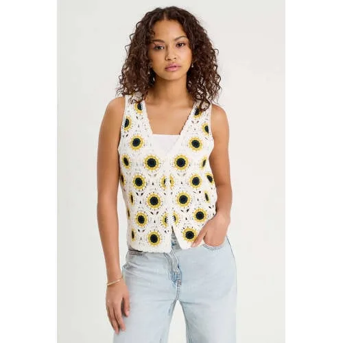 Fris, speels en toch makkelijk te combineren, dit gehaakt gilet voor dames van Cache Cache voegt direct structuur en kleur toe aan je outfit. De haaklook in ecru met gele accenten en subtiele bloemen past goed bij zonnige dagen. De decoratieve knopen aan de voorkant zorgen voor een uitgewerkte voorkant, terwijl de rechte snit zorgt voor een rustige basis.Details die je elke dag kunt dragen Rechte pasvorm met korte lengte, ideaal over een top of jurk V-hals die mooi uitkomt bij een T-shirt, blouse of hemdje Mouwloos model, prettig voor warm weer of onder een jasje Haaklook met gehaakte structuur voor een luchtig en zomers effect Decoratieve knopen aan de voorkant voor een nette afwerking Gemaakt van 60% katoen voor een zachte touch op de huid Kleurcombinatie ecru/geel met bloemendetails voor een zonnige stijl Maatadvies: dit artikel valt klein, kies bij twijfel een maat groterZomerse laag over je dagelijkse outfitsDit gilet uit de Daily collectie is geschikt als lichte extra laag over een eenvoudig T-shirt en je favoriete jeans, of over een zomerse jurk. De korte lengte legt het accent op je taille en laat hoge broeken of rokken goed tot hun recht komen.Cache Cache voor elke dagCache Cache brengt toegankelijke damesmode met een herkenbare, vrouwelijke stijl. De collecties sluiten aan op het dagelijks leven, met kleding die makkelijk te combineren is en praktisch is in gebruik. Met dit gilet voeg je eenvoudig een extra laag toe aan je garderobe die bij veel outfits past.Een luchtige, gehaakte extra laag die goed combineert met je zomeroutfits.