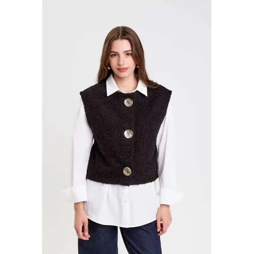 Dit vest van Cache Cache is mouwloos en gemaakt van 100% polyester. De knoopsluiting en ronde hals maken het eenvoudig te dragen, rechte mouwen geven een basic uitstraling, ideaal voor elke dag.