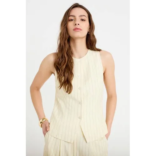 Dit mouwloze vest van Cache Cache is een fijne basic voor elke dag. De rechte snit valt soepel langs het lichaam en laat zich makkelijk combineren met je favoriete items. Dankzij de V-hals krijgt de mouwloze dames top een vrouwelijke uitstraling, terwijl de knoopsluiting zorgt voor een nette, afgewerkte look. De gestreepte kleur en de luchtige stof van viscose, linnen en katoen maken dit vest bijzonder geschikt voor het voorjaar en de zomer.Belangrijke details op een rij Mouwloos vest met rechte snit voor een rustig en modern silhouet V-hals die het decolleté subtiel accentueert Knoopsluiting aan de voorkant voor een verzorgde uitstraling Gemaakt van viscose, linnen en katoen voor een soepele, lichte touch Gestreept dessin dat makkelijk combineert met effen basics Verkrijgbaar in maat 34 tot 44 Valt klein, een maat groter kiezen wordt geadviseerd Onderhoud: machinewas op 30°C op een delicate cyclus, niet in de droger, strijken op lage temperatuur tot 110°Zo draag je dit mouwloze vestVoor een set-look combineer je dit vest met een bijpassende broek en platte sandalen. Liever casual? Draag het op een rechte high-waist jeans met een luchtige blouse in de broek en loafers eronder voor een moderne, dagelijkse outfit.Cache Cache voor elke dagCache Cache ontwerpt toegankelijke damesmode met een actuele uitstraling. De collecties zijn bedoeld voor elke dag, met kleding die je eenvoudig combineert tot looks voor werk, vrije tijd en alles daartussenin.Een veelzijdig vest dat je garderobe een praktische én stijlvolle update geeft.
