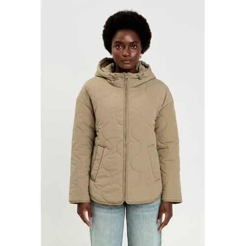 Ga comfortabel de frisse dagen tegemoet met deze Cache Cache donsjas met capuchon in zachte zandkleur. De doorgestikte uitvoering geeft een rustige, moderne uitstraling, terwijl de gewatteerde voering helpt om warmte vast te houden. Dankzij de capuchon en de praktische zakken voor is deze jas prettig in gebruik tijdens dagelijkse activiteiten, van een wandeling tot een snelle boodschap.Praktische details voor elke dag Donsjas met gewatteerde vulling voor extra warmte Capuchon voor extra bescherming bij wind en lichte regen Lange mouwen voor volledige bedekking van de armen Ritssluiting aan de voorkant voor snel aan- en uittrekken Aangespannen onderkant voor een subtiel, gestructureerd silhouet Zakken voor, handig om kleine spullen bij de hand te houden Doorgestikte, quilted afwerking voor een nette look Geschikt als tussenjas voor het lente seizoen Verkrijgbaar in maten XS tot en met XLZandkleurige tussenjas voor verschillende outfitsDe zandkleur laat zich eenvoudig combineren met diverse basics in de kledingkast. De rustige tint voegt zich gemakkelijk naar verschillende stijlen en kan zowel casual als meer geklede sets aanvullen. Een royale sjaal kan extra warmte en volume rond de hals bieden op koudere dagen.Cache Cache als vertrouwde keuzeCache Cache richt zich op kleding die past bij het dagelijks leven, met aandacht voor pasvorm en details. De collecties sluiten aan bij actuele trends, maar blijven tegelijkertijd toegankelijk en draagbaar. Zo biedt Cache Cache jassen en kledingstukken die eenvoudig in de bestaande garderobe kunnen worden opgenomen.Een comfortabele tussenjas die warmte, gemak en een rustige, moderne uitstraling combineert in één dagelijks basisstuk.