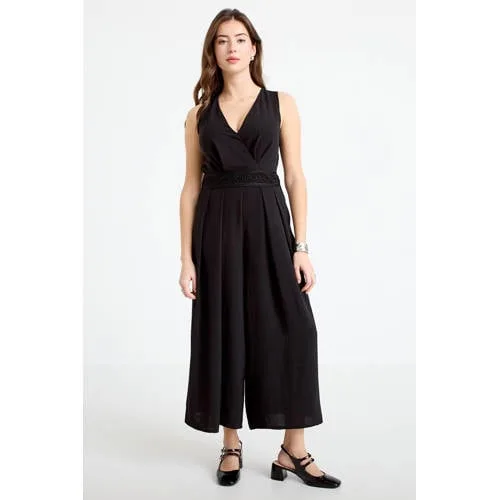 Deze zwarte jumpsuit voor dames van Cache Cache is gemaakt voor dagen waarop je er verzorgd uit wilt zien zonder lang na te denken over je outfit. De V-hals accentueert subtiel het decolleté en de wijde pasvorm geeft een luchtige, moderne uitstraling. De soepele stof valt mooi om het lichaam en beweegt gemakkelijk met je mee, ideaal voor warme zomerdagen of avonden.Zwarte jumpsuit met wijde pasvorm Mouwloze jumpsuit met V-hals voor een vrouwelijke, open halslijn Wijde pasvorm met driekwartlange pijpen voor een lichte, zomerse look Geplooid uiterlijk dat extra structuur en diepte geeft aan de stof Knoopsluiting aan de bovenkant, makkelijk aan en uit te trekken Zonder zakken voor een gladde, sierlijke belijning Zwarte kleur, eenvoudig te combineren met je favoriete schoenen en accessoires Onderdeel van de Daily collectie, geschikt voor alledaagse momenten Verkrijgbaar in maat 34 tot en met 46 Valt klein, kies bij twijfel een maat groter voor een comfortabele fitVan werkdag tot avondplanMet een paar sandalen met hakken en een gestructureerde tas draag je deze jumpsuit zo naar een etentje of afspraak. Voor een meer casual dag combineer je het wijde model met een oversized denimjas en sneakers. De zwarte basis laat sieraden en tassen extra goed uitkomen, zodat je de look steeds eenvoudig aanpast aan het moment.Cache Cache, eigentijdse mode voor elke dagCache Cache staat bekend om toegankelijke mode die goed past bij het dagelijks leven. De focus ligt op draagbare ontwerpen met een moderne twist, in maten en modellen die zijn afgestemd op verschillende figuren. Zo voeg je makkelijk nieuwe favorieten toe aan je garderobe waar je vaak naar zult grijpen.Een veelzijdig pak in één stuk dat je garderobe direct een stijlvolle update geeft.