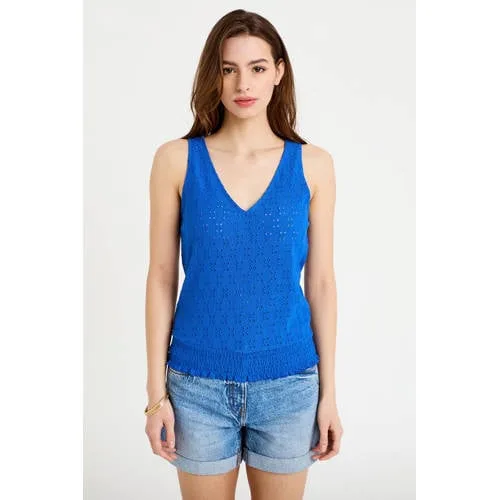 Geef je zomerse outfits een frisse update met deze blauwe mouwloze top voor dames van Cache Cache. De lange, opengewerkte tanktop valt soepel langs het lichaam en heeft een V-hals die het decolleté subtiel accentueert. De strakke, elastische onderkant geeft het silhouet een lichte structuur, waardoor de top goed op zijn plek blijft. Door de semi-transparante afwerking en fijne borduursels krijgt je look een lichte, luchtige uitstraling.Details die het verschil maken Lange tanktop met opengewerkt breisel voor een zomerse, luchtige look V-halslijn die zorgt voor een open halslijn Strakke, elastische onderkant voor een zachte, blousende pasvorm Borduursels en smockwerk voor een gedetailleerde afwerking Open rugdetail dat goed uitkomt bij zonnige dagen Mouwloos ontwerp, ideaal voor warme zomerdagen Effen blauwe kleur, makkelijk te combineren met je garderobe Verkrijgbaar in de maten XS tot en met XL Maatadvies: valt klein, kies bij twijfel een maat groterStyling voor elke zomerdagVoor een casual dagelijkse look combineer je deze tanktop met een aangesloten broek en een denim jasje. Ga je liever voor iets luchtigers, dan past een korte, wijdvallende rok en platte sandalen er goed bij. Door de semi-transparante structuur is een bijpassende top of bralette eronder een logische keuze.Cache Cache, elke dag draagbaarCache Cache ontwerpt kleding die goed past in het dagelijkse leven, met aandacht voor details en draagbaarheid. De collecties sluiten aan op de nieuwste trends, maar blijven toegankelijk en eenvoudig te combineren met wat je al in je kast hebt hangen.Een luchtige zomertop met subtiele details voor zonnige dagen.