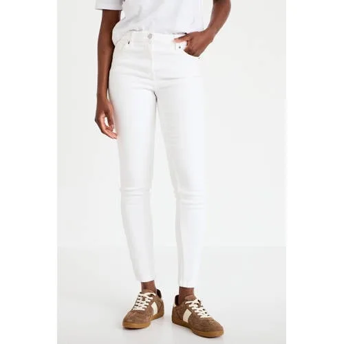 Geef je dagelijkse outfits een frisse basis met deze witte skinny jeans van Cache Cache. De nauwsluitende pasvorm volgt je benen tot aan de enkel en de standaard taille zorgt voor een middenhoge aansluiting. Door het subtiele push-up effect worden je rondingen extra geaccentueerd, terwijl het katoen met een beetje stretch soepel met je meebeweegt.Belangrijke details op een rij Skinny model met lange, smalle pijpen voor een slank silhouet Standaard taillehoogte voor een gebalanceerde en comfortabele fit Push-up effect aan de achterkant voor extra accent op de rondingen Zachte, stevige jeansstof met stretch door het elastaan Klassieke 5-pocket styling en riemlussen voor je favoriete riem Rits- en knoopsluiting voor een veilige en nette afwerking Effen witte kleur, ideaal als basis voor verschillende combinaties Verkrijgbaar in maat 34 tot en met 46 Valt klein, een maat groter kiezen wordt aangeradenVan werkdag tot weekendVoor een nette werkdag combineer je deze jeans met een vloeiende blouse in de broek, enkellaarsjes en een blazer. In het weekend wissel je eenvoudig naar een aangesloten trui, mocassins en een lange trenchcoat voor een moderne, rustige look.Cache Cache, stijl voor elke dagCache Cache richt zich op basics die makkelijk te dragen zijn in het dagelijks leven. Iedere collectie draait om comfortabele pasvormen, actuele modellen en kleuren die je eenvoudig combineert met de rest van je garderobe.Een veelzijdige witte jeans die zich soepel aanpast aan jouw dag, van kantoor tot een avondje uit.