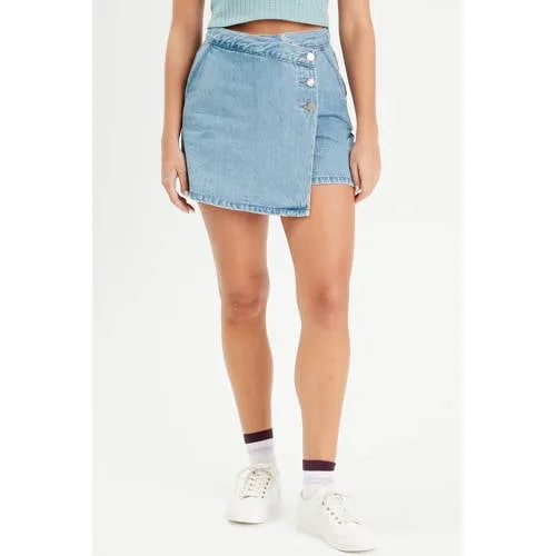 Deze Cache Cache rok is een skort in light blue denim. De mini lengte en asymmetrische overslag geven het een speelse uitstraling. Met de rits- en knoopsluiting is de rok eenvoudig te sluiten. Zakken achter en voor bieden extra opbergruimte.