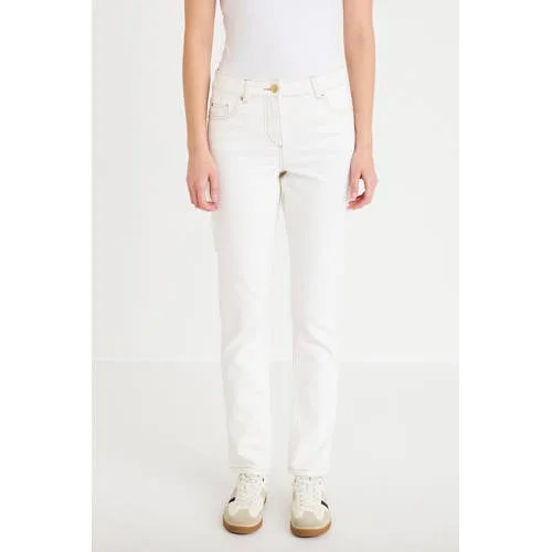 Deze witte slim fit jeans van Cache Cache is een goede basis voor je garderobe. Het model sluit mooi aan langs de benen en volgt de lijnen van het lichaam, waardoor het silhouet optisch wordt verlengd. De standaard taille valt op de heupen en zorgt voor een klassieke, comfortabele pasvorm. De jeans is gemaakt van katoen met een klein percentage elastaan, zodat de stof licht meebeweegt bij elke stap.Details die elke dag werken Slim fit model dat nauw aansluit langs het been Standaard taille voor een vertrouwde pasvorm rond de heupen Kleur: white denim met effen uitstraling Materiaal: 99% katoen en 1% elastaan voor subtiele stretch Lange pijpen, ideaal voor dagelijks gebruik Rits- en knoopsluiting aan de voorkant Praktische vijfpocket styling met achter- en voorzakken Voorzien van riemlussen voor het dragen van een ceintuur Beschikbaar in maat 34 tot en met 44 Valt klein, bij twijfel is een maat groter geschikt Onderhoud: machinewas op 30°C, binnenstebuiten wassen, geen drogerWitte jeans voor veelzijdige momentenDe white denim kleur geeft een frisse, heldere basis die eenvoudig te combineren is met verschillende tops. Zowel voor een werkdag, een etentje als een ontspannen weekend is deze jeans geschikt, doordat het model netjes aansluit zonder te strak te voelen.Cache Cache als vertrouwde keuzeCache Cache staat bekend om modieuze items die goed aansluiten op het dagelijks leven. De focus ligt op comfortabele pasvormen, toegankelijke stijlen en materialen die prettig aanvoelen, zodat je steeds weer terug kunt grijpen naar favoriete basics zoals deze jeans.Een rustige en betrouwbare basis voor outfits op allerlei momenten.