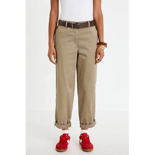 Voor een verzorgde dagelijkse look is deze grijsgroene chino broek voor dames een praktische basis. De 7/8 lengte en slanke sigarettenpasvorm laten je benen optisch langer lijken, terwijl de standaard taille een tijdloos silhouet geeft. De stof bevat katoen, wat licht en aangenaam aanvoelt op de huid. Achter in de taille zit elastiek verwerkt, zodat de broek mooi aansluit zonder te knellen. De afneembare riem geeft extra structuur rond je middel en maakt het makkelijk om je outfit telkens anders te stylen.Details die elke dag kloppen Chino model met 7/8 lengte, geschikt voor een luchtige, moderne look Slim-fit sigarettenpasvorm voor een slank silhouet Standaard taille met rits- en knoopsluiting voor praktisch draaggemak Elastische tailleband achter voor extra comfort in het dagelijks leven Afneembare riem om je middel te accentueren of te wisselen met je eigen riem Bevat katoen voor een soepele en prettige touch Met steekzakken voor en paspelzakken achter Beschikbaar in maat 34 tot 44, dit artikel valt kleinStyling voor werk en weekendVoor een nette werkdag combineer je de broek met een vloeiende blouse in de taille en loafers. In het weekend staat de cropped lengte mooi met een aansluitende gebreide top, denim jasje en enkellaarsjes.Cache Cache in jouw kledingkastCache Cache ontwerpt kleding die je makkelijk in het dagelijkse leven draagt, met oog voor pasvorm en actuele trends. Met deze chino voeg je een basic toe die er verzorgd uitziet en door de elastische tailleband comfortabel aanvoelt, seizoen na seizoen.Een broek waarmee je eenvoudig een moderne outfit samenstelt.