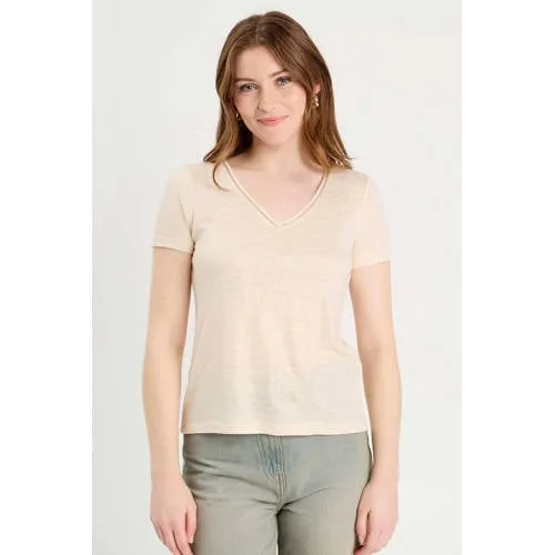 Voor een subtiel glanzende look is dit iriserend T-shirt met korte mouwen van Cache Cache een basis in je garderobe. Het beige shirt heeft een rechte snit en een V-hals, waardoor het netjes rond je hals en schouders valt. De iriserende glans en fijne glitterdetails geven het effen ontwerp extra uitstraling, terwijl de korte, rechte mouwen zorgen voor een luchtig gevoel.Details die het verschil maken Rechte snit met aansluitende pasvorm voor een vrouwelijk silhouet V-hals die openvalt langs de halslijn Korte, rechte mouwen voor een frisse, dagelijkse look Iriserend aspect met glitters en lurex voor een subtiele sparkle Effen beige kleur die rustig oogt en makkelijk te combineren is Gemaakt van viscosemix voor een soepele, zachte touch Semi-transparante stof, ideaal met een basishemdje eronder Handig om te weten: dit model valt klein, veel vrouwen kiezen een maat groterStyling voor alledaagse momentenDit T-shirt uit de 'Daily' collectie past goed bij je dagelijkse outfits. Combineer het met een hoge jeans en sneakers voor een ontspannen dag, of draag het op een nette broek met sandalen voor een eenvoudige avondlook. De iriserende glans laat het shirt zowel overdag als in de avond goed uitkomen.Cache Cache voor elke dagCache Cache staat bekend om toegankelijke mode met een speelse twist. De collecties sluiten aan op het dagelijkse leven, met kleding die prettig draagt en er verzorgd uitziet. Zo stel je met weinig moeite outfits samen waar je je de hele dag comfortabel in voelt.Een glanzend T-shirt dat je gemakkelijk inpast in je dagelijkse garderobe.
