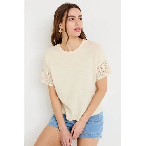 Voor een frisse, vrouwelijke basis in je garderobe is dit Cache Cache dames T-shirt met korte mouwen een veelzijdige basic. De rechte pasvorm en ronde hals geven een rustige uitstraling, terwijl de haak-look inzetten op de mouwen zorgen voor een subtiel detail. In de zachte ecru tint 'BIRCH' combineer je dit T-shirt gemakkelijk met je favoriete jeans, rok of pantalon.Verfijnde details voor elke dag Rechte snit die soepel langs het lichaam valt Ronde hals die mooi aansluit zonder te strak te zitten Korte, rechte mouwen voor een luchtig gevoel Haak-look inzetten op de mouwen voor een decoratieve touch Gemaakt van 60% katoen voor een zachte, comfortabele touch Effen ecru kleur die makkelijk te combineren is in je dagelijkse outfits Valt klein, een maat groter kan extra comfort gevenMakkelijk te stylen in elk seizoenDit T-shirt past goed in een dagelijkse garderobe. In de lente combineer je het met een lichte jeans en sneakers, op warmere dagen met een luchtige rok of short. De neutrale kleur maakt het ook geschikt onder een blazer of vest voor een meer geklede look.Cache Cache: modieuze basics met aandacht voor detailCache Cache richt zich op toegankelijke mode met een vrouwelijke uitstraling. De collecties zijn ontworpen voor dagelijks gebruik, met aandacht voor pasvorm en doordachte details die je outfit net wat meer karakter geven. Zo voeg je met ieder item eenvoudig een nieuwe combinatie toe aan je kledingkast.Een zacht T-shirt met een bijzonder mouwdetail voor uiteenlopende outfits.