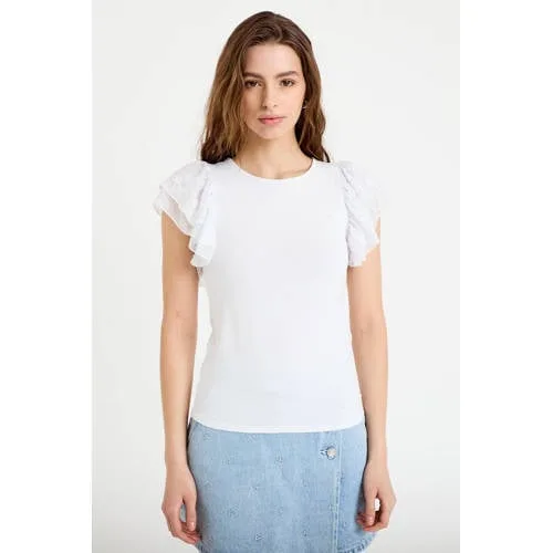 Dit ecru kanten T-shirt voor dames met vlindermouwen van Cache Cache is een lichte basic met subtiele details die je elke dag kunt dragen. De getailleerde pasvorm volgt je figuur op een natuurlijke manier, terwijl de ronde hals zorgt voor een rustige, tijdloze uitstraling. Door het zachte katoen met een beetje elastaan voelt het T-shirt soepel aan en blijft het de hele dag prettig zitten. Het kant en de fijne ruches geven het shirt een verfijnde, vrouwelijke look die net even meer doet dan een simpel basic T-shirt.Details die het verschil maken Getailleerde pasvorm die je silhouet mooi accentueert Ronde hals en korte vlindermouwen voor een luchtige uitstraling Kant en ruches als subtiel, vrouwelijk detail Zachte, lichte stof met 95% katoen en 5% elastaan Effen ecru kleur, makkelijk te combineren met je garderobe Verkrijgbaar in XS tot XL, valt klein, kies bij twijfel een maat groter Geschikt voor dagelijks gebruik in het lente seizoenStyling voor elke dagCombineer dit T-shirt met een vloeiende midi-rok en enkellaarsjes voor een vrouwelijke look, of draag het met een broek met hoge taille en loafers voor een moderne, dagelijkse outfit. Door de neutrale kleur past het eenvoudig bij verschillende stijlen.Cache Cache, vertrouwde stijl voor elke dagCache Cache richt zich op toegankelijke mode met een moderne uitstraling. De collectie bestaat uit draagbare items met doordachte details, zodat je garderobe zowel praktisch als stijlvol blijft.Een lichte, vrouwelijke basic die je makkelijk inpast in je dagelijkse outfits.