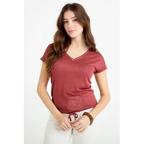Deze Cache Cache dames top met korte mouwen is een luchtige basic voor iedere dag. De effen kleur en de V-hals geven een rustige, vrouwelijke uitstraling, terwijl de striksluiting zorgt voor een subtiel detail. Ideaal voor het voorjaar en lichte lentedagen, maar ook makkelijk door te dragen onder een vest of blazer.Strikdetail en soepel draagcomfort Korte mouwen, prettig voor het voorjaar en milde zomerdagen V-hals die de halslijn mooi accentueert Striksluiting voor een verstelbare pasvorm en een speelse touch Effen design, eenvoudig te combineren met jeans, rok of nette broek Gemaakt van een soepele stof met 58% viscose, die zacht aanvoelt op de huid Maatadvies: dit artikel valt klein. Wij adviseren een maat groter te bestellen.Geschikt voor jouw dagelijkse routineDe top komt uit de 'Daily' collectie en is bedoeld voor alledaags draaggemak. Combineer met een high waist jeans en sneakers voor een ontspannen dag, of draag de top met een nette broek en loafers voor een meer geklede look op kantoor.Cache Cache als vertrouwde keuzeCache Cache richt zich op draagbare mode met een frisse, moderne uitstraling. De collecties zijn ontworpen voor dagelijks gebruik, met aandacht voor details en pasvorm. Zo voeg je eenvoudig nieuwe favorieten toe aan je garderobe waar je vaak naar grijpt.Een fijne basis waarmee je moeiteloos verschillende outfits samenstelt.