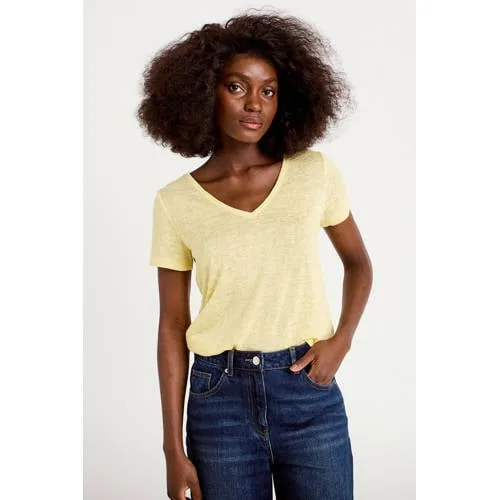 Fris, licht en speels: dit lichtgele Cache Cache T-shirt met strikken op de rug geeft je dagelijkse outfits een zomerse update. De effen kleur maakt het een fijne basic, terwijl de open achterkant met strikdetails zorgt voor een opvallend accent. Ideaal voor warme dagen, of je nu naar je werk gaat of een terrasje pakt.Speelse achterkant met strikdetails Recht model dat soepel langs het lichaam valt V-hals die de halslijn subtiel accentueert Korte, rechte mouwen voor een luchtig gevoel Open rug met strikken als opvallend detail Licht materiaal met semi-transparante look Effen lichtgele kleur, gemakkelijk te combineren Zonder zakken voor een rustige, gladde voorkant Maatadvies: dit artikel valt klein, kies bij twijfel een maat groterZomerse top voor alledaagse combinatiesDeze top past goed bij je dagelijkse garderobe. In combinatie met een lichte jeans, linnen broek of rok creëer je in een paar tellen een zomerse look. De open rug komt mooi uit bij een warme dag of een avondje uit en laat je outfit net wat anders ogen dan een standaard T-shirt.Cache Cache, eigentijdse mode voor elke dagCache Cache staat bekend om toegankelijke mode met een vrouwelijke en moderne uitstraling. De collecties zijn afgestemd op het dagelijks leven, met items die makkelijk te combineren zijn en meegaan met de trends. Zo voeg je eenvoudig een frisse, stijlvolle top toe aan je kast waar je vaak naar zult grijpen.Een lichte, speelse basic die je zomerse outfits meteen meer karakter geeft.