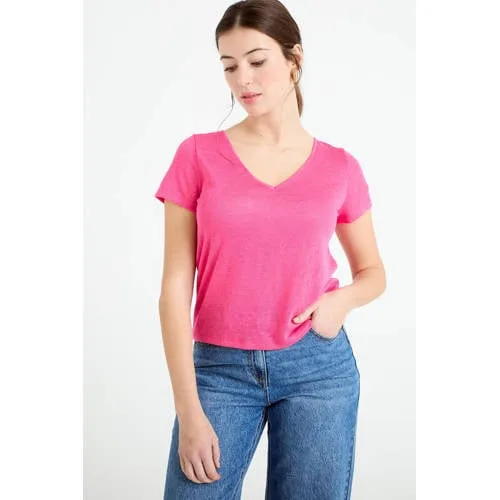 Voor zonnige dagen en luchtige outfits is deze dames top met korte mouwen van Cache Cache een fijne basis. De top heeft een vrouwelijke V-hals en een effen kleur, waardoor deze top makkelijk te combineren is met je favoriete jeans, rok of short. Door de lichte viscosestof voelt de top soepel aan op de huid, ideaal voor warme zomerdagen.Verfijnde details aan de voor- en achterkant V-hals aan de voorkant voor een open en vrouwelijke uitstraling Open rugdetail met strikje voor een subtiel accent aan de achterkant Semi-transparante stof die licht en luchtig oogt Rechte korte mouwen voor een ontspannen pasvorm rond de armen Effen ontwerp dat makkelijk te combineren is met verschillende stijlen Geschikt voor dagelijks gebruik in de zomercollectie Valt klein volgens het maatadviesLuchtige top voor elke zomerdagDeze top past goed in een dagelijkse garderobe voor de zomer. De luchtige stof en open rug maken het een prettig item voor warme dagen, terwijl de effen kleur ervoor zorgt dat je hem zowel casual als iets gekleder kunt dragen.Cache Cache: eigentijdse mode voor elke dagCache Cache richt zich op moderne vrouwen die houden van toegankelijke mode met een frisse uitstraling. De collecties bevatten items die prettig dragen in het dagelijks leven en tegelijk net dat beetje extra detail bieden, zoals een bijzonder rugdetail of een mooie halslijn.Een zomerse top die comfort en subtiele details combineert in één fijn item.