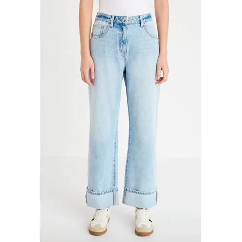 Deze wide leg jeans dames Cache Cache is een moderne basisbroek met een ontspannen silhouet. De regular waist sluit aan in de taille, terwijl de wijde pijpen voor een rechte, luchtige lijn zorgen. De lange lengte geeft een rustige uitstraling en past goed bij zowel platte schoenen als hogere laarzen. Dankzij de effen kleur laat deze jeans zich eenvoudig combineren met verschillende stijlen en bovenstukken.Stijlvolle details voor dagelijks gebruik Wide leg model voor een rechte, wijde pijp van heup tot zoom Gemaakt van 100% katoen voor een stevige denimlook Regular waist voor een comfortabele pasvorm in de taille Rits en knoopsluiting aan de voorkant 5 pocket ontwerp met twee achterzakken, twee voorzakken en een muntzakje Riemlussen voor het dragen van een favoriete riem Omgeslagen broekspijpen voor een verzorgd en casual effect Maatadvies: dit artikel valt klein, kies bij twijfel een maat groterOntspannen stijl voor verschillende momentenMet het wijde model en de omgeslagen zoom past deze jeans bij uiteenlopende momenten op de dag. Van een ontspannen dag thuis tot een nette casual look op kantoor, de broek vormt een rustige basis voor veel outfits.Cache Cache als vertrouwde keuzeCache Cache richt zich op eigentijdse mode met toegankelijke ontwerpen. Het merk combineert draagbare modellen met doordachte details, zodat je kunt rekenen op kleding die prettig zit en er verzorgd uitziet.Een veelzijdige jeans die je garderobe aanvult met een moderne, comfortabele basis.
