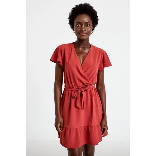Op zoek naar een luchtige zomerjurk die je figuur goed laat uitkomen Deze koraalrode wikkeljurk voor dames heeft een korte, uitlopende pasvorm die het silhouet optisch verlengt en zorgt voor extra beweging bij elke stap. De V-hals legt de nadruk op het decolleté, terwijl de korte mouwen met ruches een zacht detail toevoegen. De soepel vallende stof voelt licht aan, zodat de jurk de hele dag prettig draagt, of je nu naar je werk gaat of een terrasje pakt.Kenmerken van de koraalrode jurk Korte jurk met mini lengte, ideaal voor warme zomerdagen Uitlopende skater pasvorm die subtiel taille en benen accentueert V-hals die het decolleté op een nette manier laat zien Korte, wijde mouwen met ruches voor een luchtige uitstraling Wikkelmodel met striksluiting en ceintuur voor een verstelbare taille Effen koraalrode kleur die direct voor een zomerse look zorgt Zonder zakken, waardoor de lijn van de jurk gelijkmatig blijft Beschikbaar in maat 34 tot 46 Valt klein, een maat groter bestellen wordt aangeradenVoor dagelijkse zomermomentenDeze jurk past goed in je dagelijkse garderobe. Combineer met platte sandalen en een schoudertas voor een ontspannen daglook, of draag er enkellaarsjes en een denim jasje bij voor extra accent op frissere avonden.Cache Cache, stijl voor elke dagCache Cache richt zich op eigentijdse mode die makkelijk te combineren is in het dagelijks leven. De collecties hebben een toegankelijke stijl, met silhouetten en details die inspelen op trends en toch draagbaar blijven. Zo voeg je met deze jurk eenvoudig een frisse basic aan je zomergarderobe toe.Een praktische keuze voor dagen waarop je je licht en verzorgd wilt kleden.