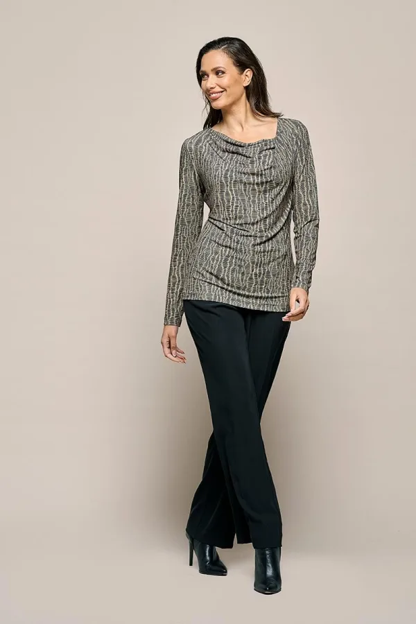 De Caitlin print top in taupe en zwart is een onmisbaar item voor je garderobe! Deze zachte en opvallende top heeft een unieke grafische dierenprint in taupe en zwart, die een modieus statement maakt. De asymmetrische watervalkraag zorgt voor een flatterende pasvorm, terwijl de mooie print je een trendy en zelfverzekerde uitstraling geeft. De top valt tot op de heup. Combineer moeiteloos met de Evanne broek in taupe voor een stijlvolle look die geschikt is voor elke gelegenheid. Voeg hakken en accessoires toe om je outfit compleet te maken, of draag de top casual met een jeans of een rok. De Caitlin print top is ook verkrijgbaar in een kobaltblauwe zigzagprint, een rode zigzagprint en effen navy.