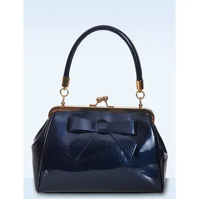''California... knows how to party!'' Dit kleine zusje van de klassieke American Vintage bag heeft een opvallende goudkleurige metalen klipsluiting voor een echte vintage look en is uitgevoerd in navyblauw imitatie lakleder afgewerkt met een schattige strik. * Small sized * Klipsluiting * Binnenvak met 3 extra vakjes, waarvan 1 met rits * Afneembaar hengsel * Kan crossbody gedragen worden * Volledig gevoerd * Groot genoeg voor je telefoon, sleutels, en een kleine portemonnee