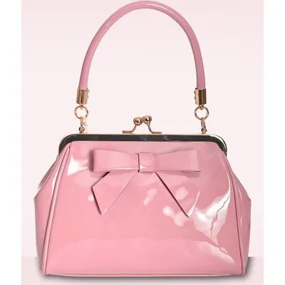 ''California... knows how to party!'' Dit kleine zusje van de klassieke American Vintage bag heeft een opvallende goudkleurige metalen klipsluiting voor een echte vintage look en is uitgevoerd in lichtroze imitatie lakleder afgewerkt met een schattige strik. * Small sized * Klipsluiting * Binnenvak met 3 extra vakjes, waarvan 1 met rits * Afneembaar hengsel * Kan crossbody gedragen worden * Volledig gevoerd * Groot genoeg voor je telefoon, sleutels, en een kleine portemonnee