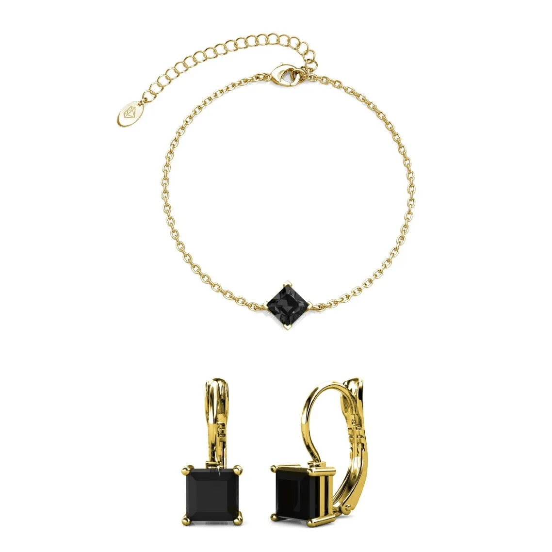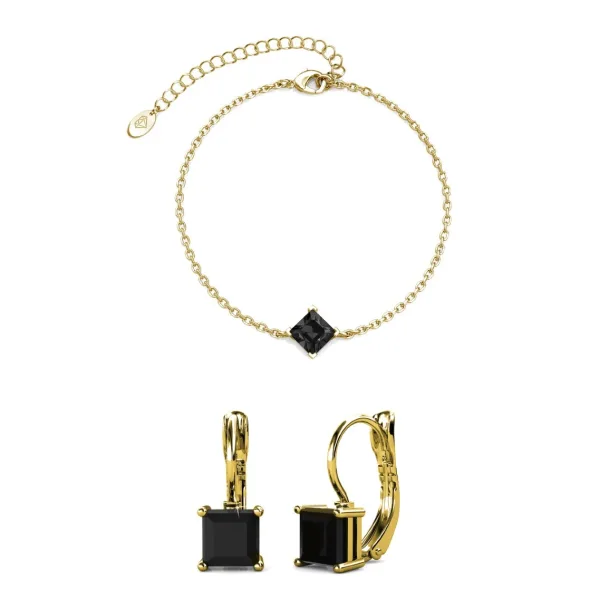 Samenstelling: Messing Afwerking: 18k verguld Steensoort: Oostenrijks kristal Aantal stenen (stuks): 3 Steenkleur: Zwart Armbandlengte (mm): 170 + 50 Oorbellenlengte (mm): 7,25