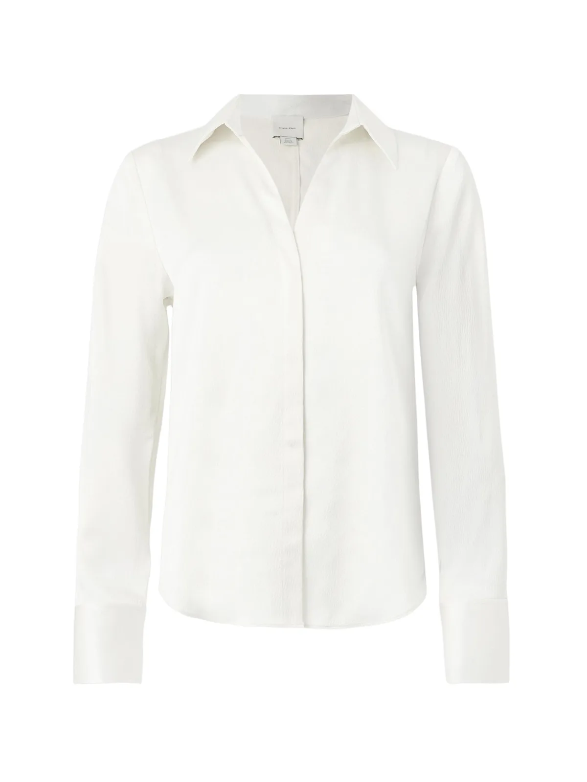 Blouse type: Klassieke blouse; Design: Gevoerde zoom/rand, Verborgen knop placket; Type sluiting: Knoopsluiting; Materiaal: Satijn; Motief: Effen; Kraag: Kentkraag; Extra's: Op staal naden, Lichte stof; Pasvorm: Normale pasvorm; Armlengte: Lange mouw; Lengte: Normale lengte