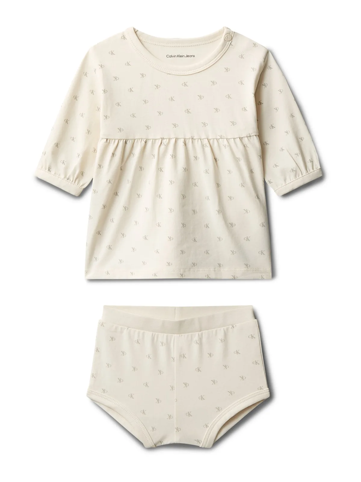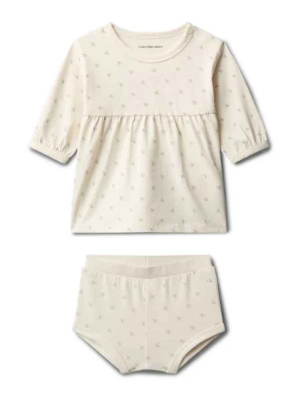Design: Gevoerde zoom/rand, Ingelegde zoom/rand, Elastische taille/zoom, Ingelegde kraag; Type sluiting: Drukknoop; Materiaal: Jersey; Motief: Logoprint; Extra's: All-over patroon, Voelt zacht aan, Label print, Huidvriendelijk materiaal; Aantal per set: 2-delig; Lengte: Knielengte; Setinhalt Kleidung: Unterhose, Kleid; Pasvorm: Normale pasvorm; Armlengte: Lange mouw