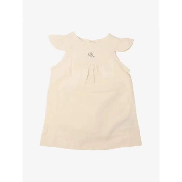 De Calvin Klein Baby Linnen Jurk in de kleur Oyster Gray is gemaakt van Linnen kwaliteit. De jurk heeft roezel mouwtjes en een geborduurd logo in grijs op de voorkant.