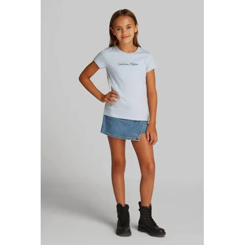 Dit T-shirt van Calvin Klein is perfect voor meisjes. Het heeft een grijsblauwe kleur en een ronde hals. Gemaakt van 100% katoen, met korte mouwen voor een comfortabele pasvorm. Een mooie keuze voor iedere dag.